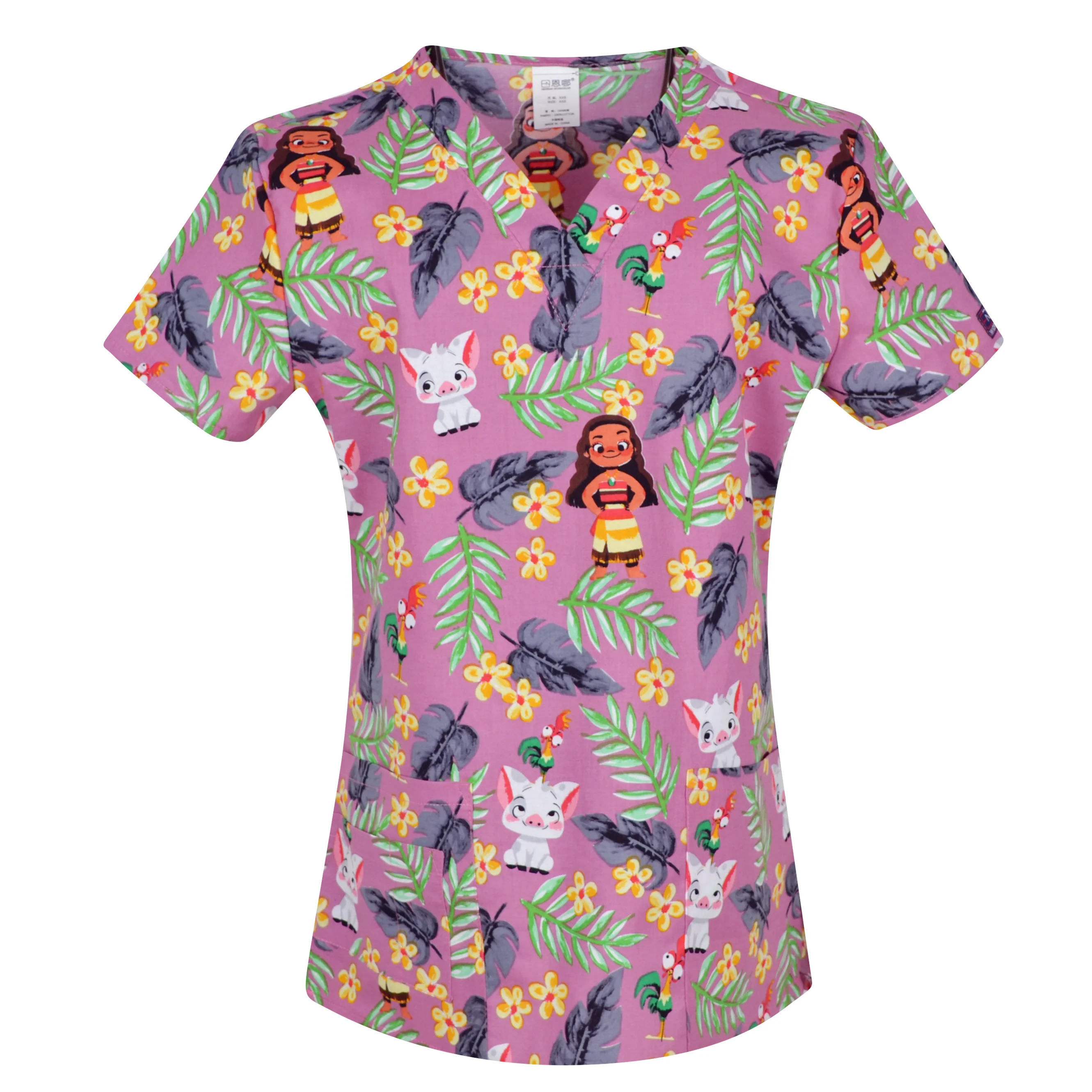 Hennar Women Scrub Tops Medical With V Neck 100% Cotton Surgical Short Sleeve Cartoon Print 2019 High Quality Scrubs Top Female