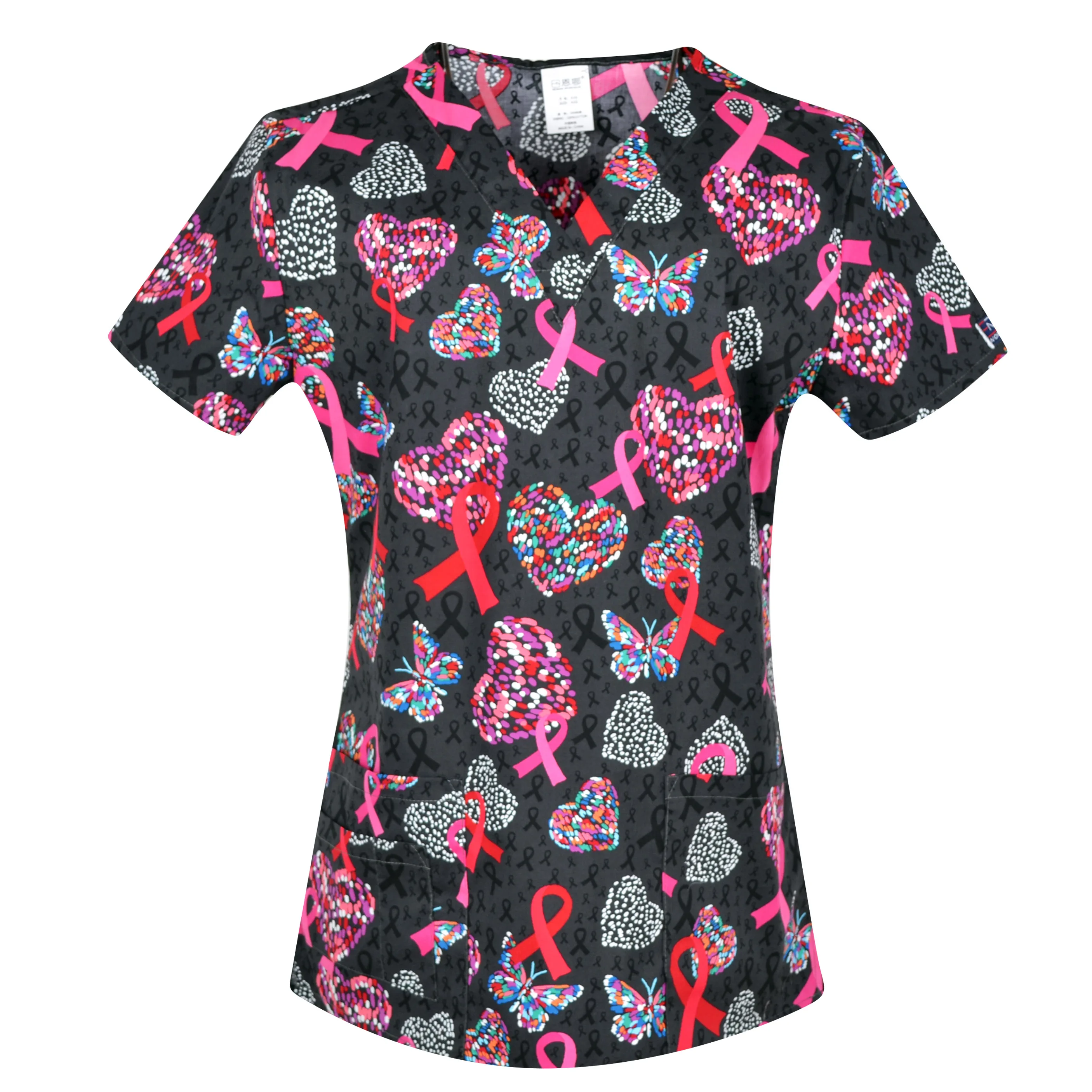 Hennar Women Scrub Top V-Neck Print Hospital Medical Uniforms Short Sleeve 100% Cotton Clinical Women's Surgical Scrubs Top