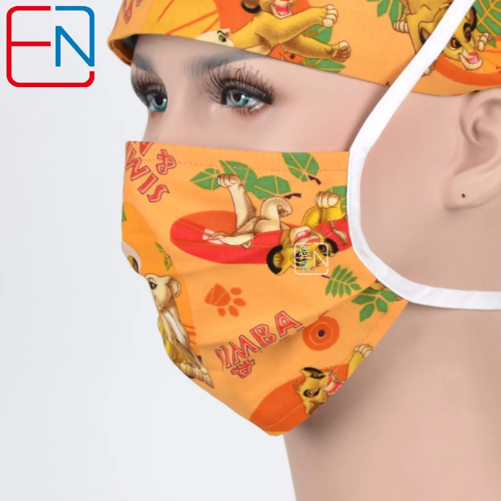 Hennar Doctor Scrub Hats Mask Women Green Cartoon Print Surgical Hats Clinic Cap Cotton High Quality Scrub Surgical Caps Masks