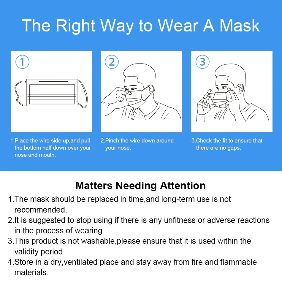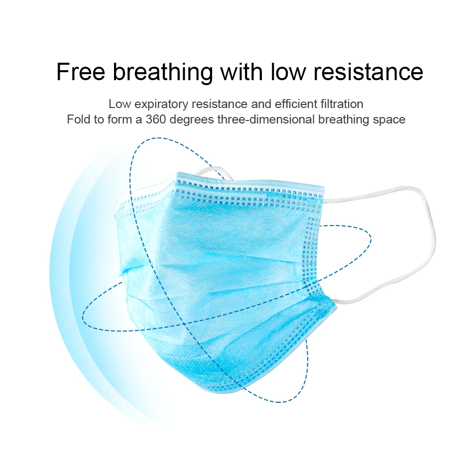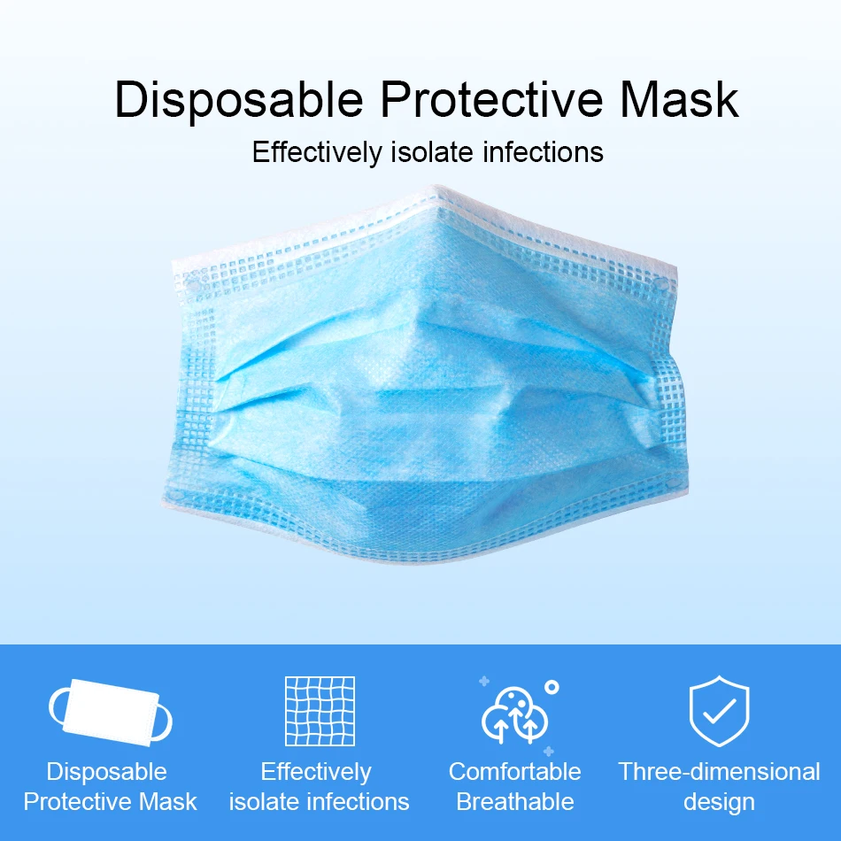 1.100% brand new and high quality.2. Protection: three layers of cleaning dust, toxic gases in the air, and a skin-friendly filter cloth that gives you plenty of protection, protects against dust, allergens and pollution.3. Color: blue4. Packing: plastic bag5. Type: disposable mask