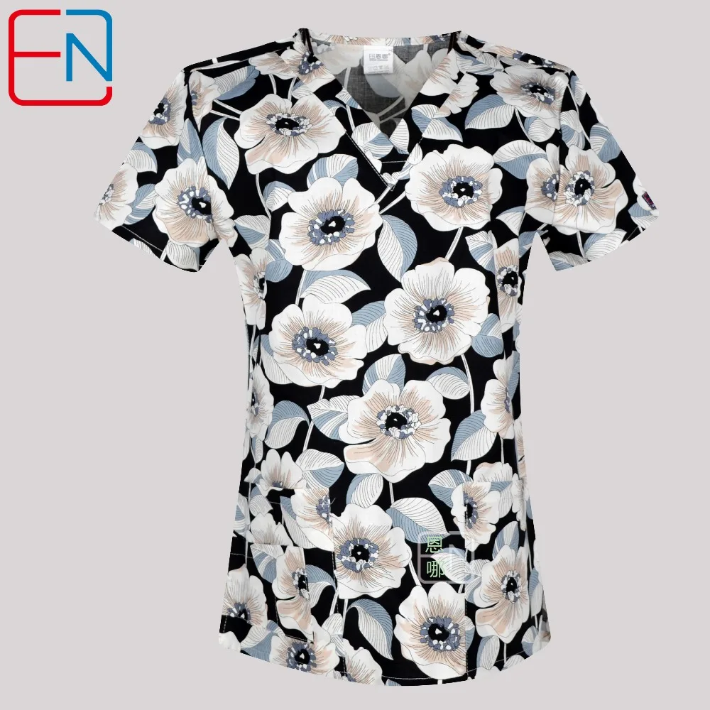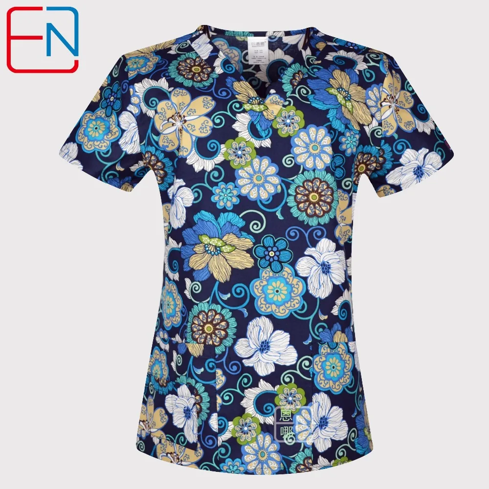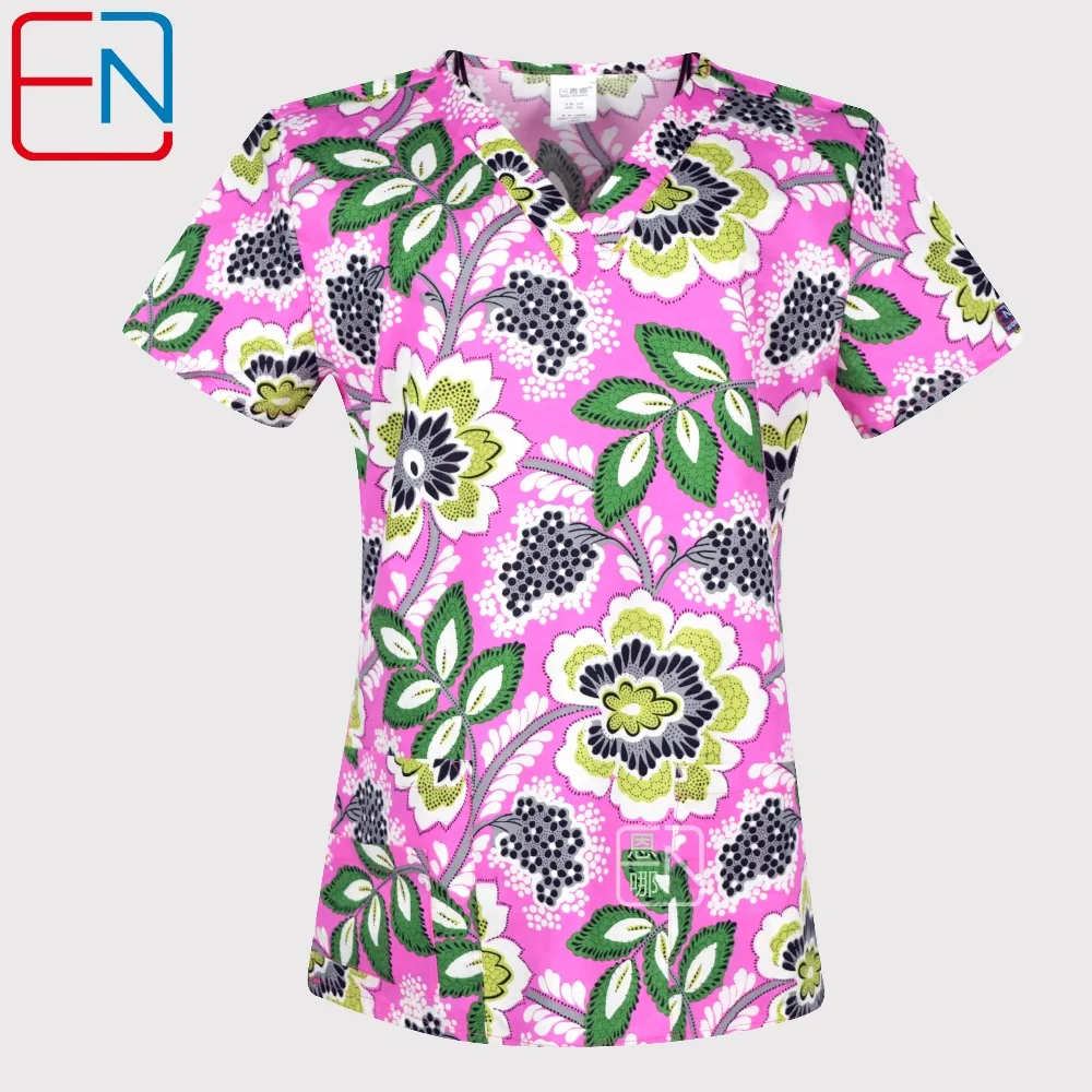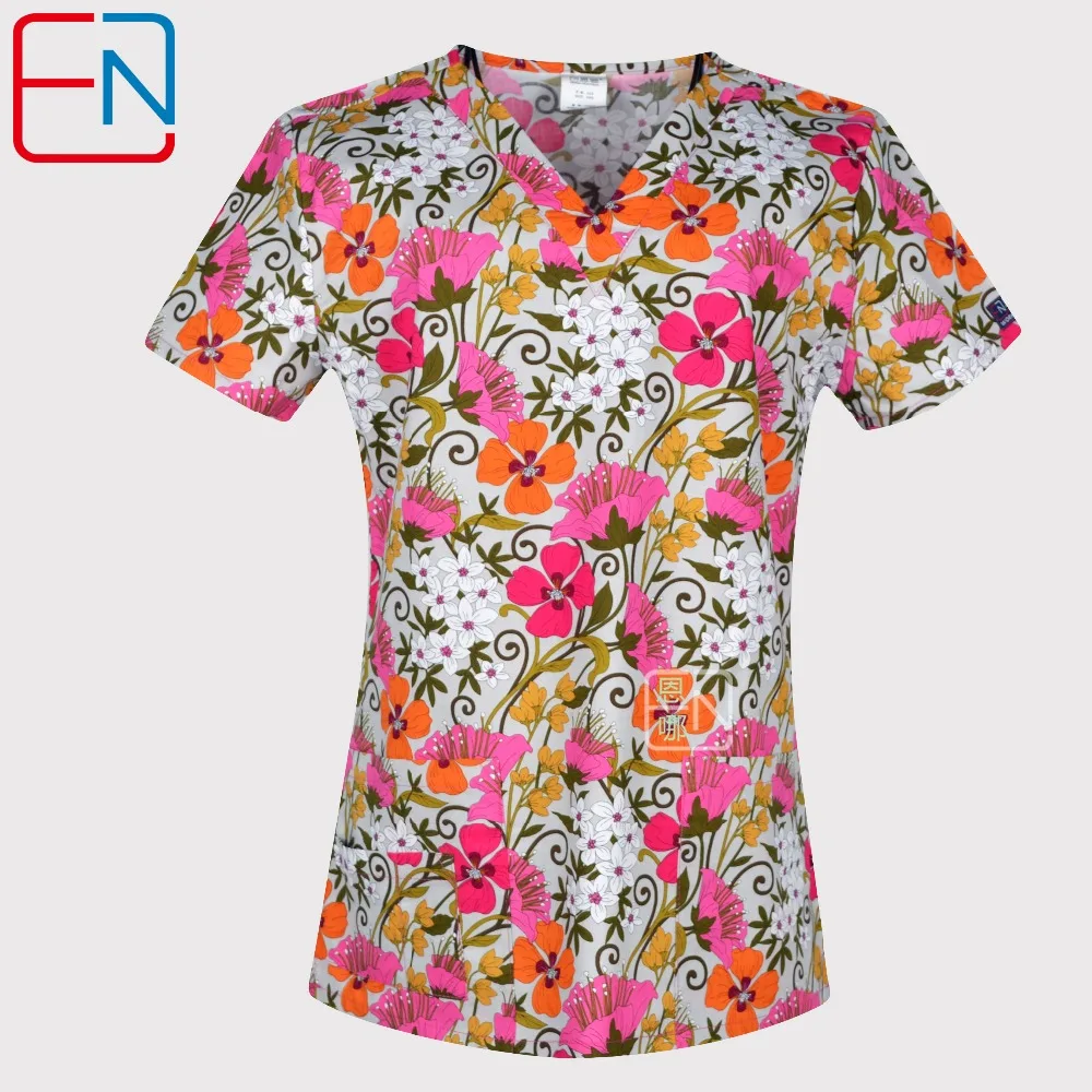 Best Price Comparison With Hennar Print Women Medical Scrub Tops Short Sleeve medical uniforms with V neck in floral design