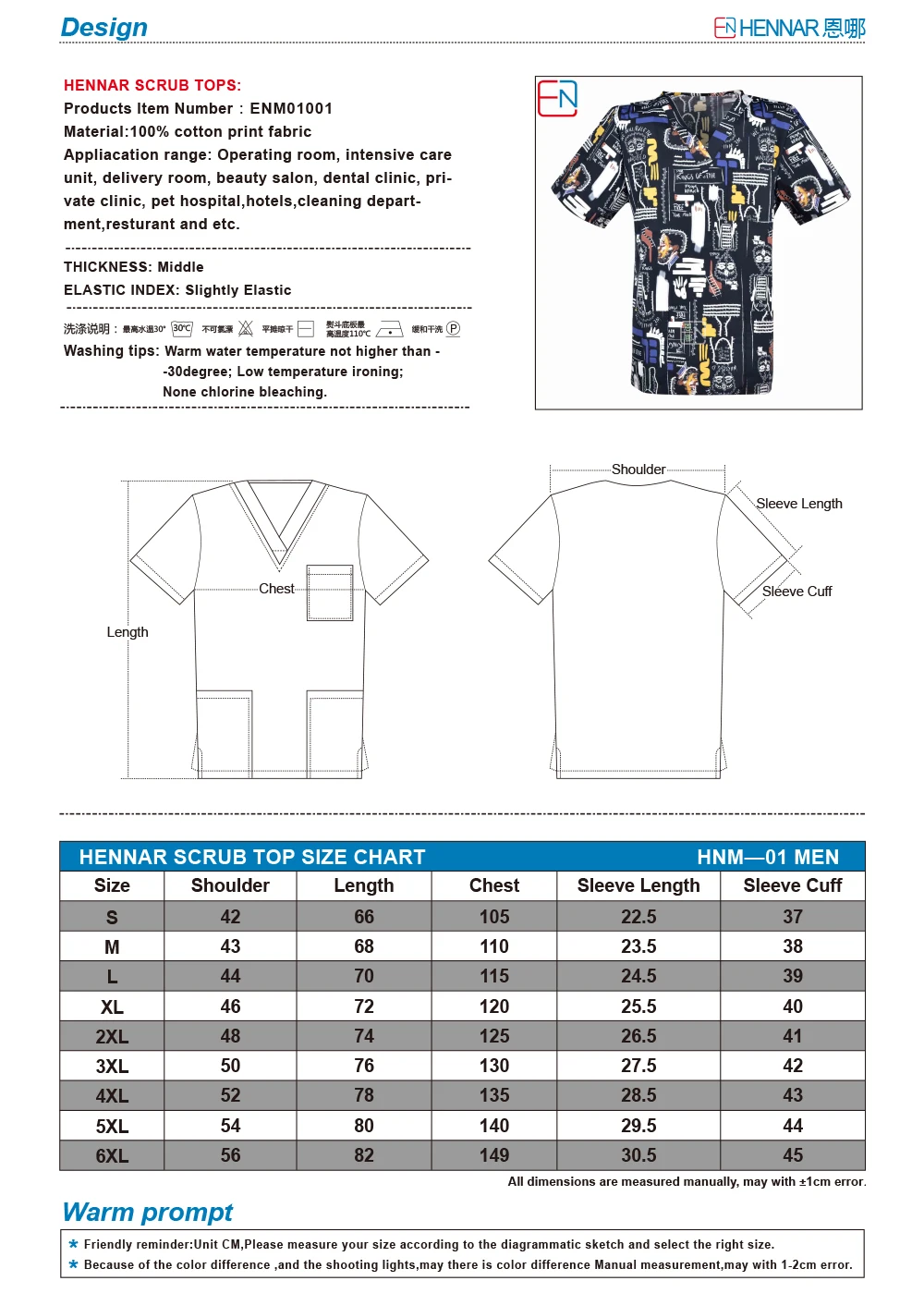 1910 NEW Hennar Women Scrub Top With V-Neck 100% Cotton Print Surgical Medical Uniforms Hospital Nurse Scrub Tops For Women
