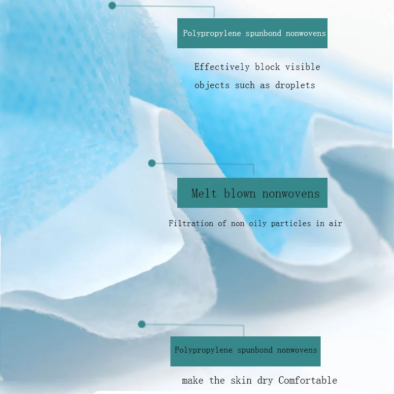1.Three layer protect: Non-woven outer layer +filtration paper layer+skin-friendly Non-woven Inner layer.breathable comfort, low respiratory resistance.2. Plasticity nose bridge strip, Hide the sides of the fixed nose.more suitable for all face types.3.High-elastic flat ear strap. Will not tighten the ears.4.Inner layer:skin-friendly Non-woven .soft and comfortable Reduce the probability of skin allergies.5.Physical ultrasonic welding.Encrypted welding point.Strong and durable.Fine workmanship.
