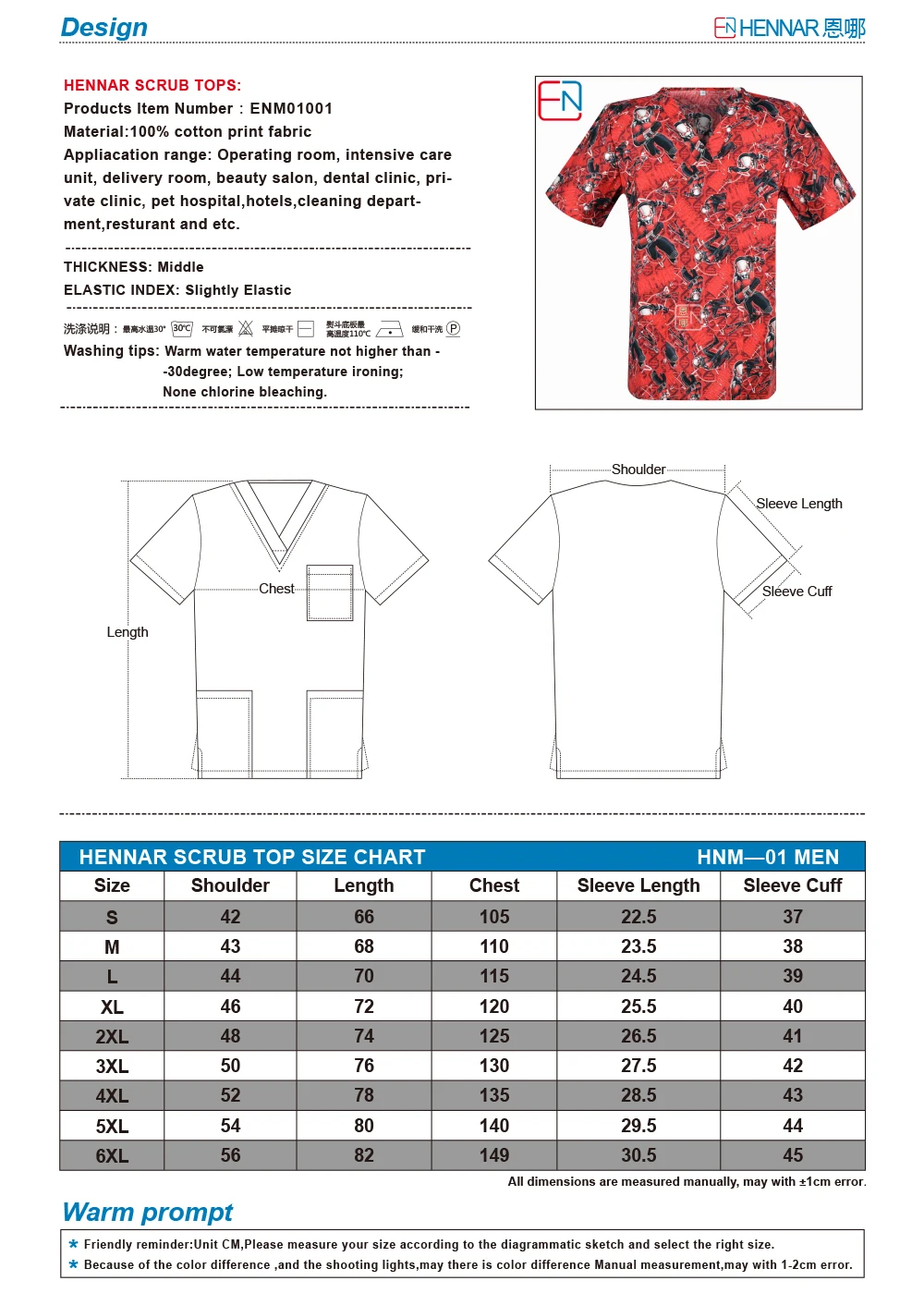 1910 NEW Hennar Women Scrub Top With V-Neck 100% Cotton Print Surgical Medical Uniforms Hospital Nurse Scrub Tops For Women