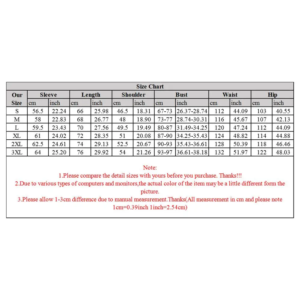 Size:3XL Sleeve:64cm(25.19inch) Length:76cm(29.92inch) Shoulder:54cm(21.25inch) Bust:93cm-97cm(36.61inch-38.18inch) Waist:132cm(51.96inch) Hip:122cm(48.03inch)