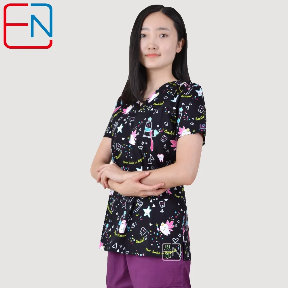 Big sale Hennar Women Scrub Top With V-Neck 100% Cotton Print Surgical Medical Uniforms Hospital Nurse Scrub Tops For Women